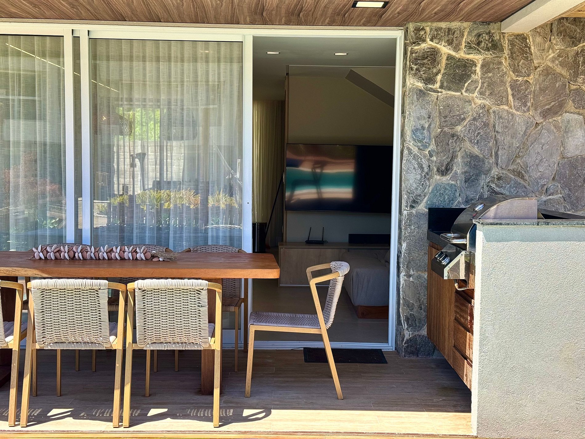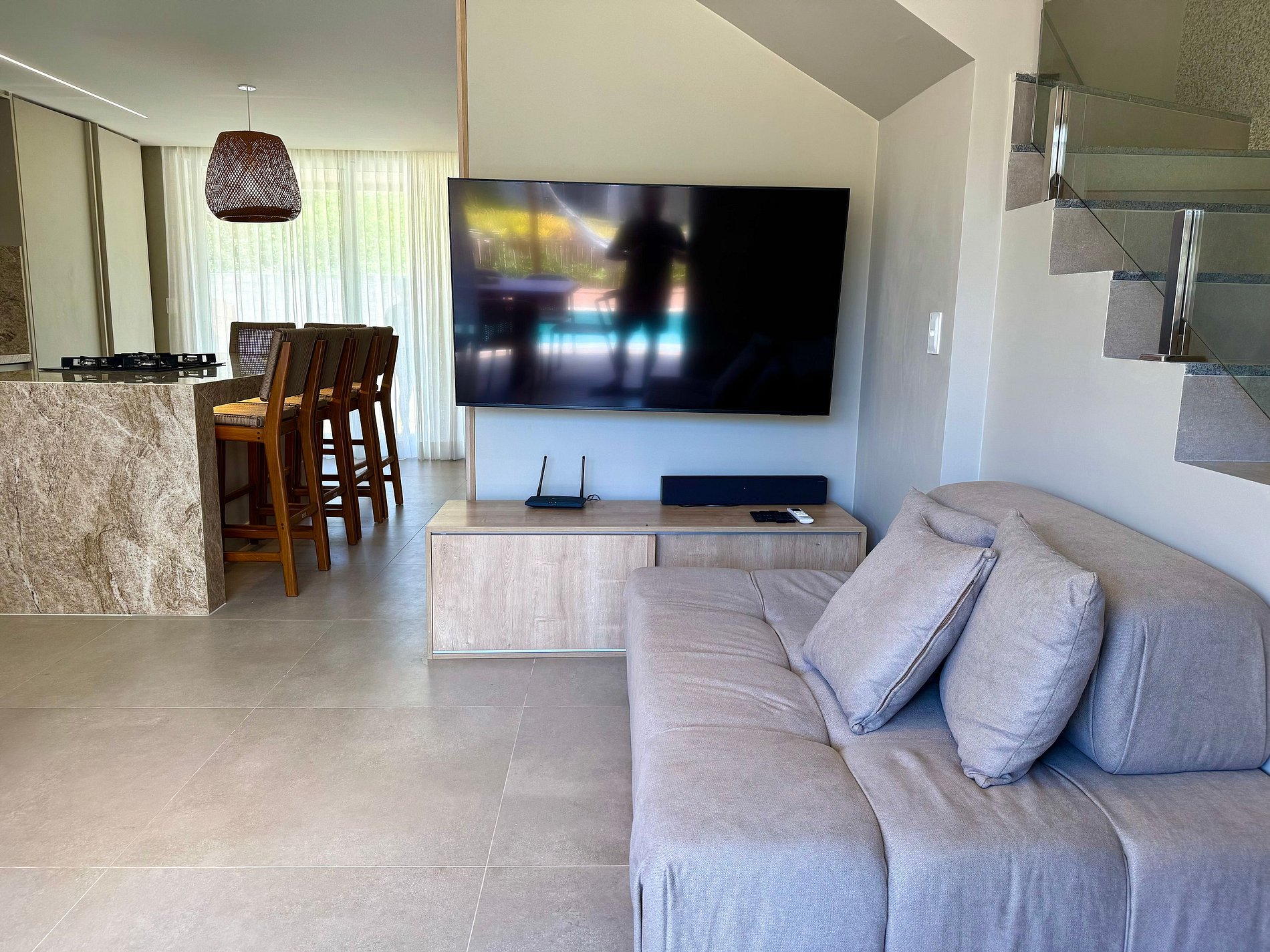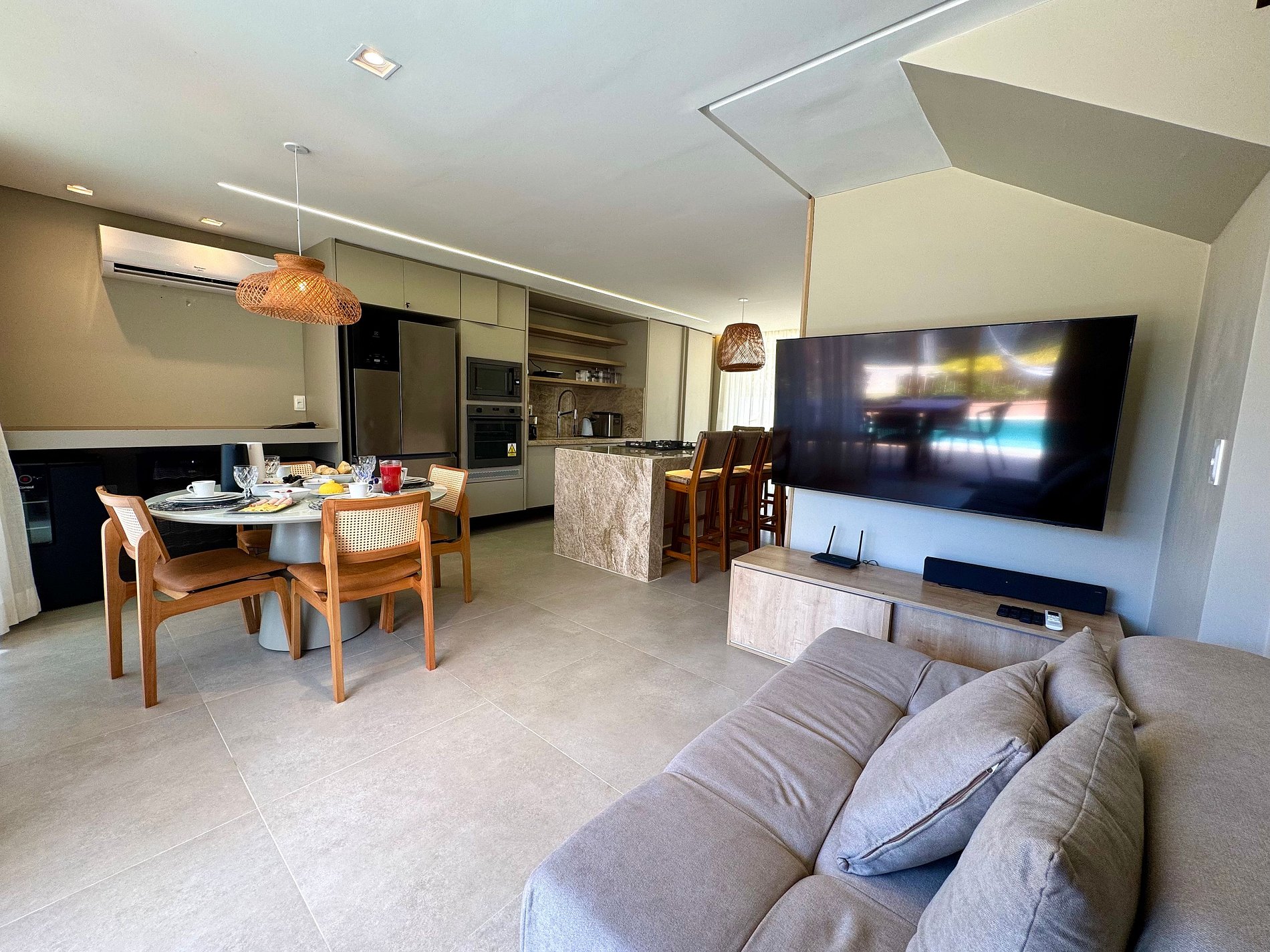 A casa tem sala de Tv Smart com wifi de alta velocidade. Casa com vista para o beach club